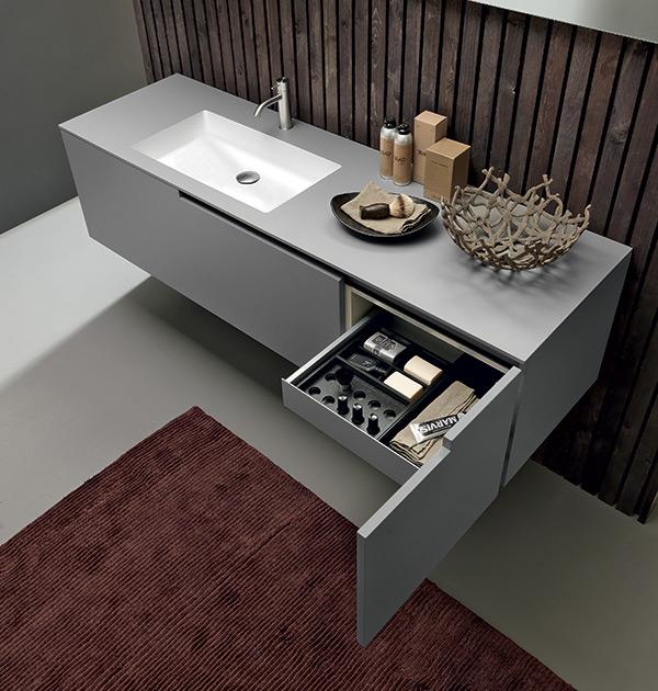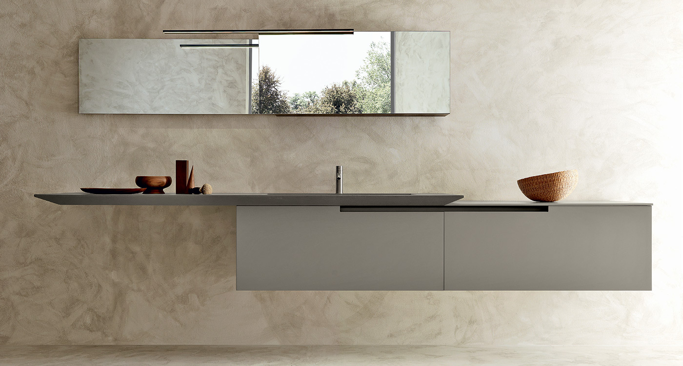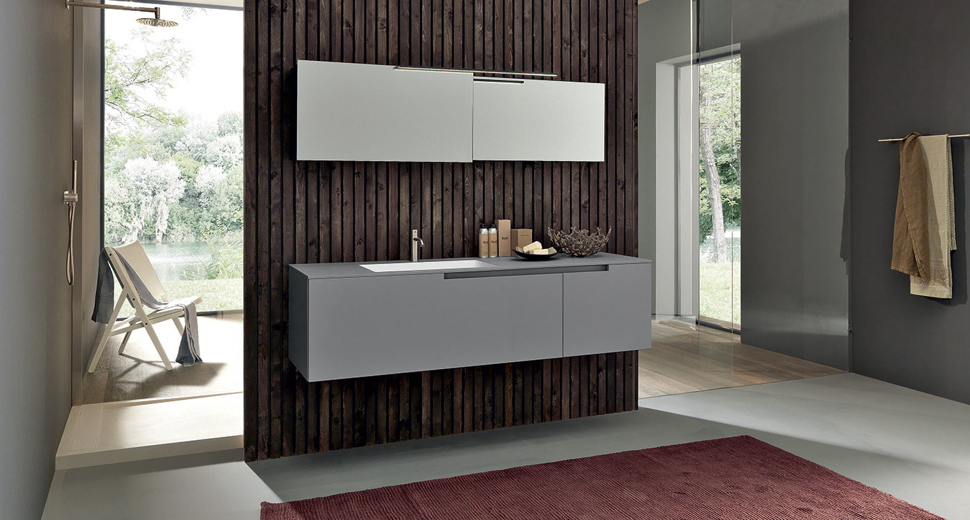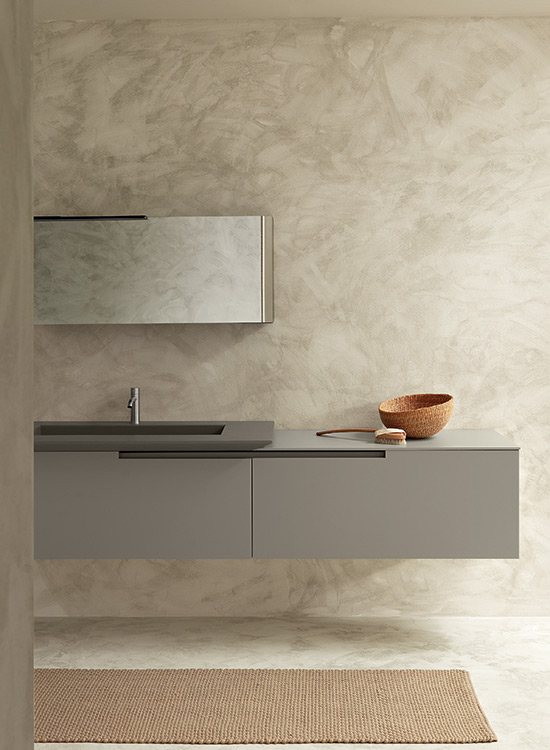 An irreal atmosphere not belonging to the surrounding world ready to embrace our intimacy. From a minimalist approach to a structured concept for an oasis of peace. In this new approach to the bathroom the top with integrated basin, which can be made in Geacril and Tecnoril, concrete resin or raw oak, turns into a furnishing element and acquires a new identity. A further outstanding feature of Moon Cross is the lack of handles. The door shape and a metal profile fastened to the structure allow opening doors and drawers very easily.
