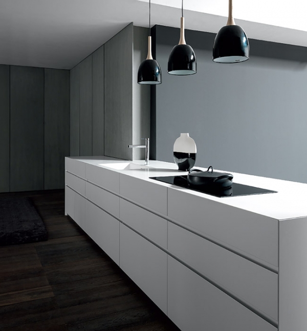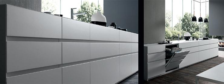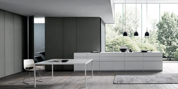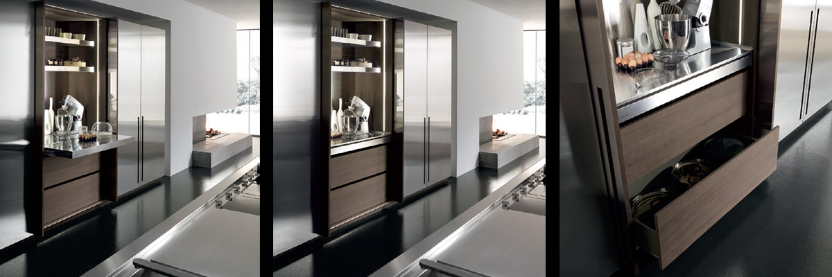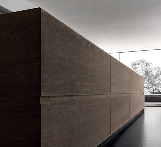 Fly, a perfect symbiosis between functionality and extremely simple uncluttered lines, is packed with personality with its stainless steel insert incorporating a sink and cooking hob installed flush with the top on an oxidised walnut worktop. It also features 45° chamfered edges that not only unite the fronts with the worktop and side panels, but also act as a grip with which to open the door or front.