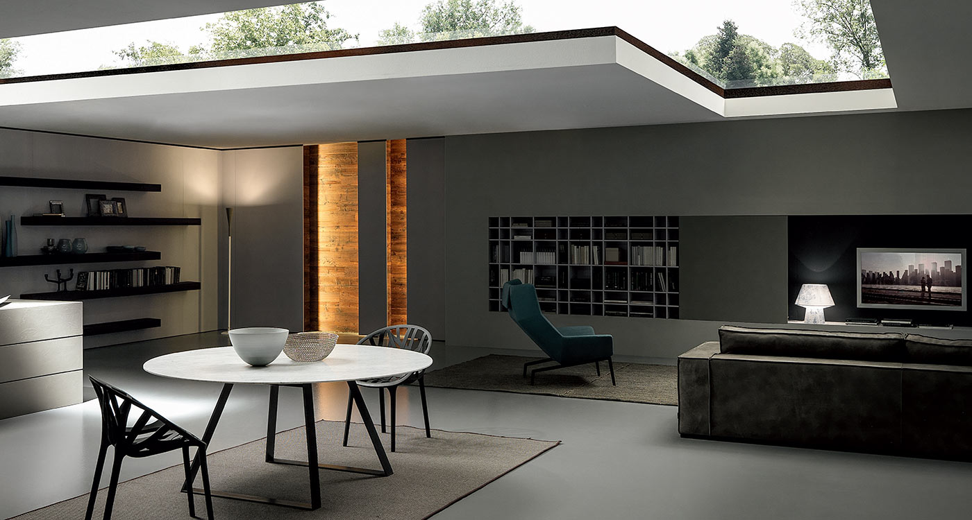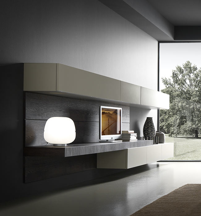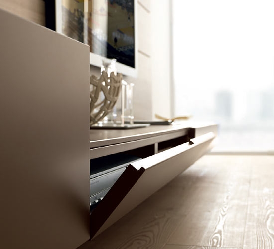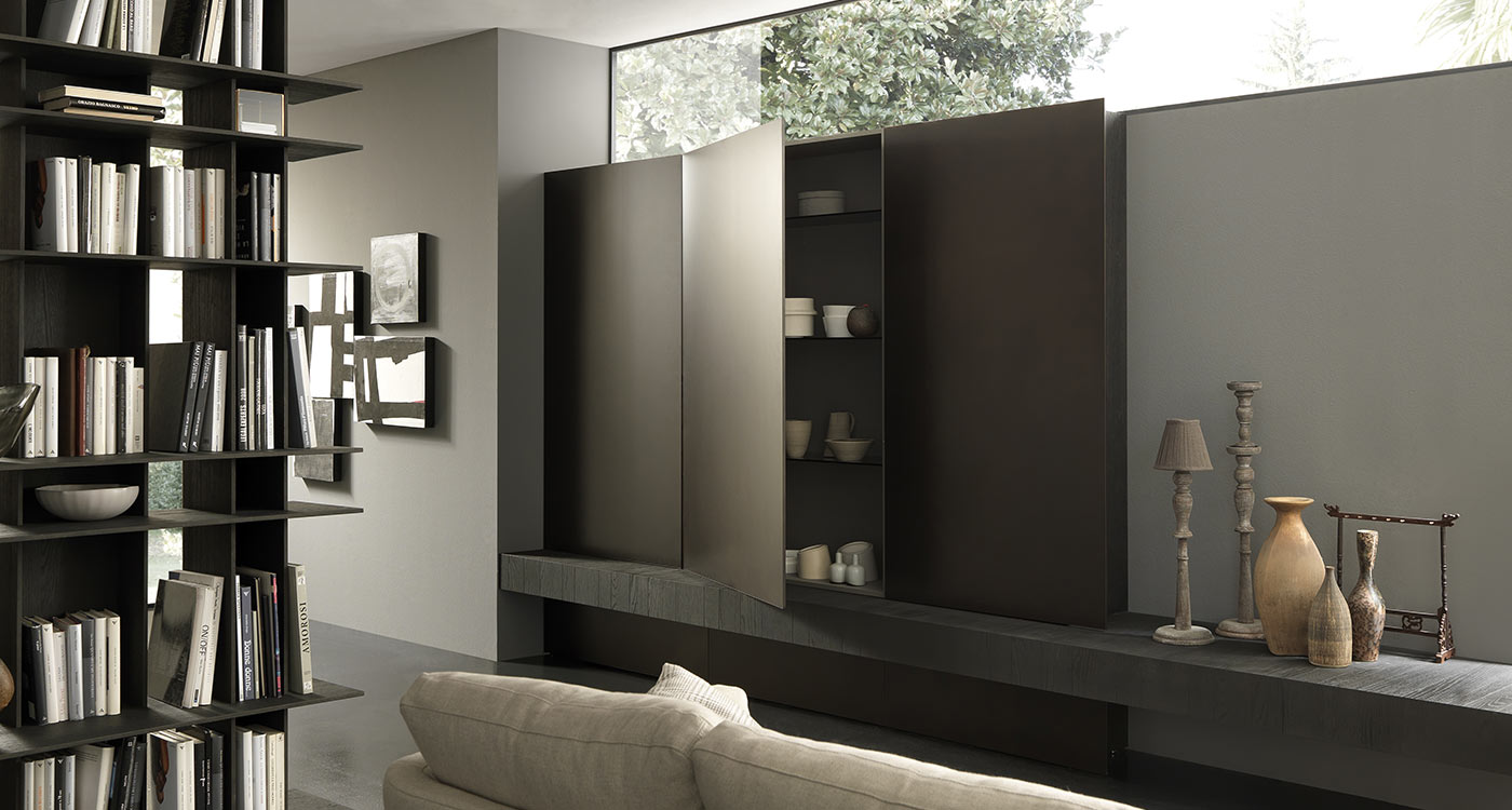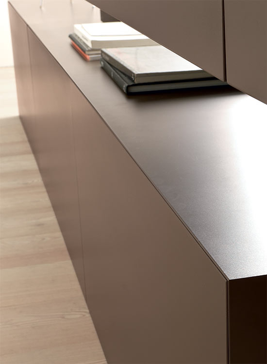 The Blade living room collection is innovative and exlusive. 1cm thick door with aluminium honeycomb panel plated on 2 sides, to which the chosen finish is applied: lacquered, Fenix laminate, wood, metal or resin (photo: concrete grey resin). Alternating 15cm hinged (push-pull opening) and protruding doors (with or without cut-outs to accommodate base units) to create niches between tall units that can be faced with side and back panels in any of the finishes available (photo: cendre concrete resin) and provided with dimming LED illumination.