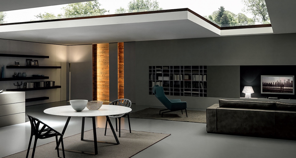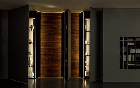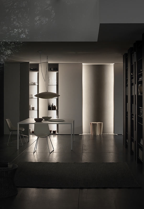 The Blade daytime collection provides a variety of solutions designed to meet all needs: floor-standing tall units (max h. 2700 mm), tall units to stand on base units (which may be Blade, More or Face), wall units (available in heights of 900 or 1200mm) inset on the wall with flush doors that spurn the classical concept of a living room.